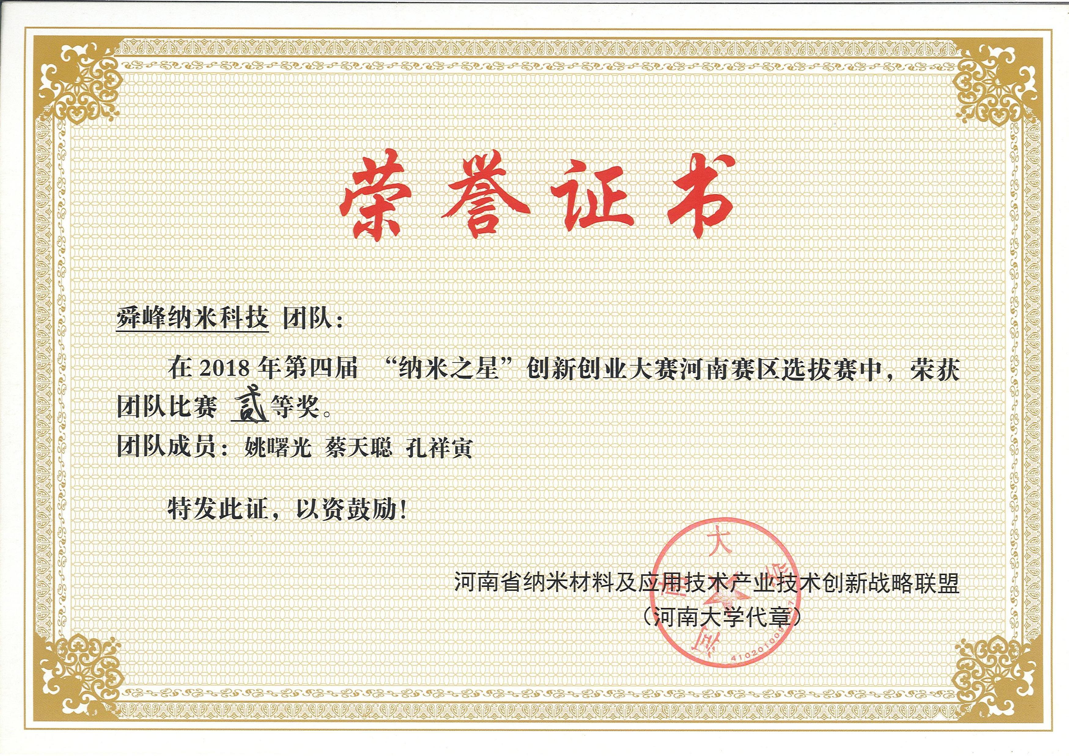 2018年第四屆“納米之星”創(chuàng)新創(chuàng)業(yè)大賽河南賽區(qū)團隊比賽二等獎